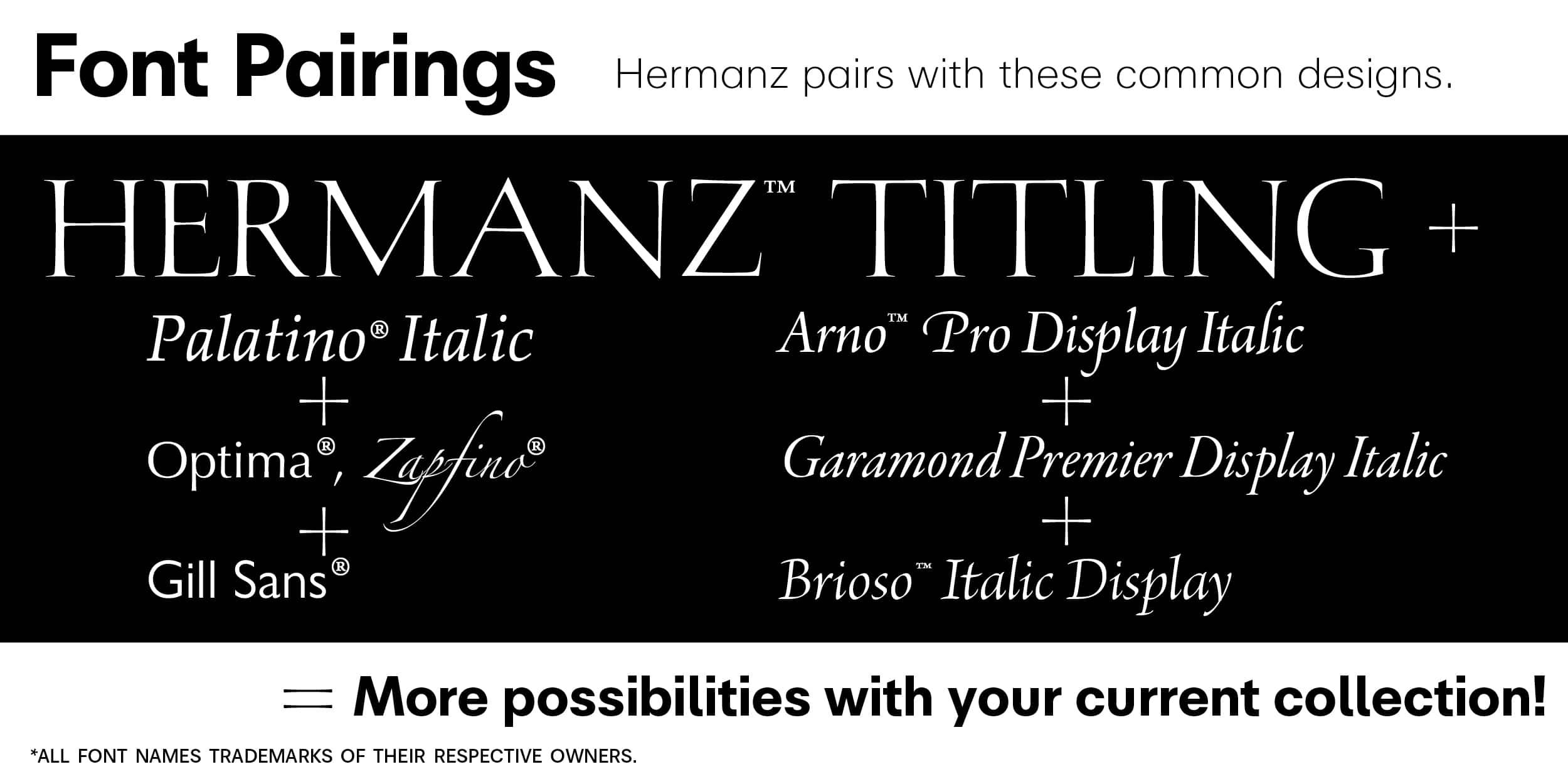 The elegant letters work well as monograms, either overlapping or touching.