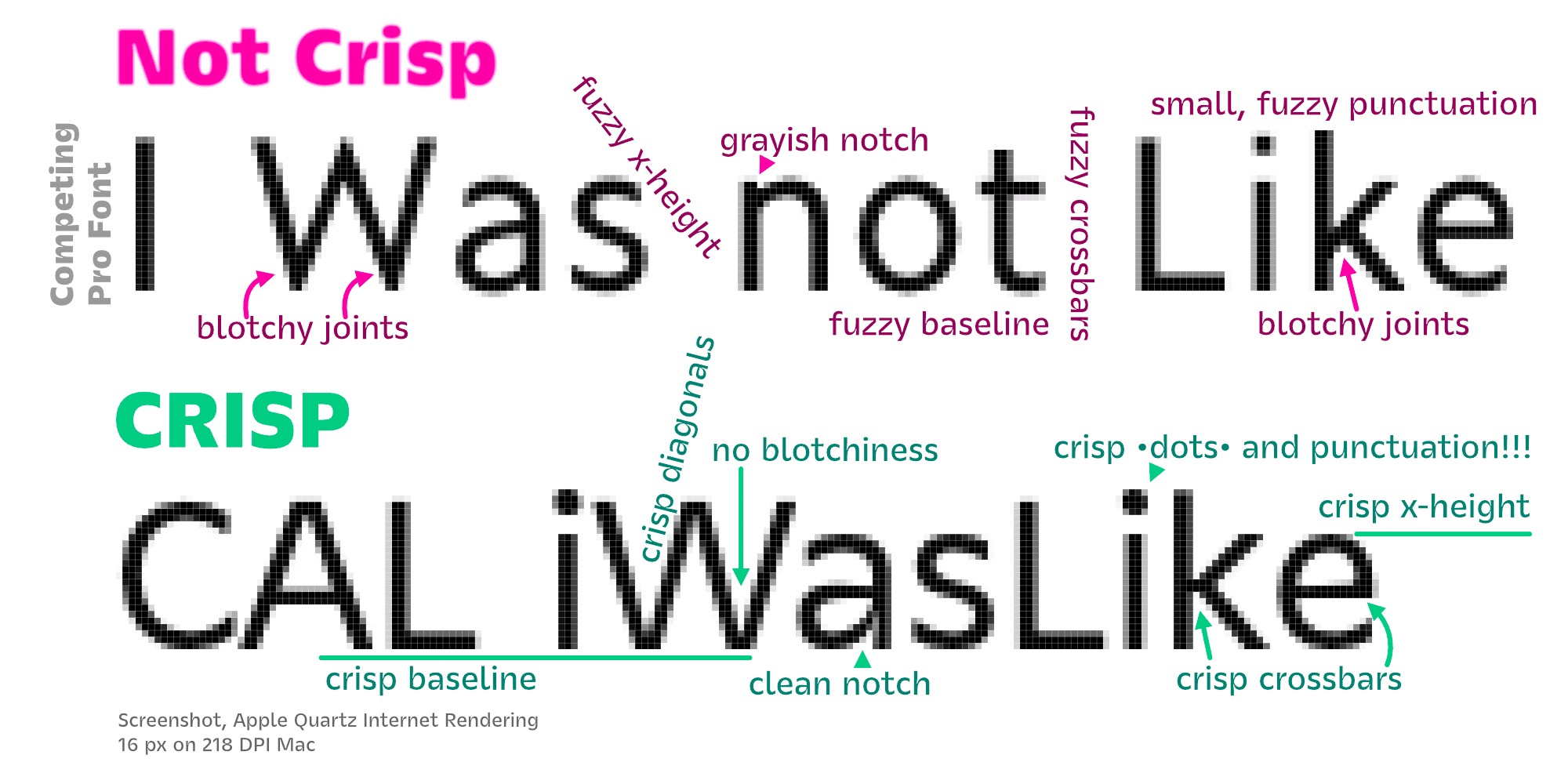 Optimized for internet and reading sizes (well, printer and pixel grid but that sounds too technical). While other fonts get fuzzy or distorted, iWasLike keeps crisp and clear due to fuzz elimination at the design level.